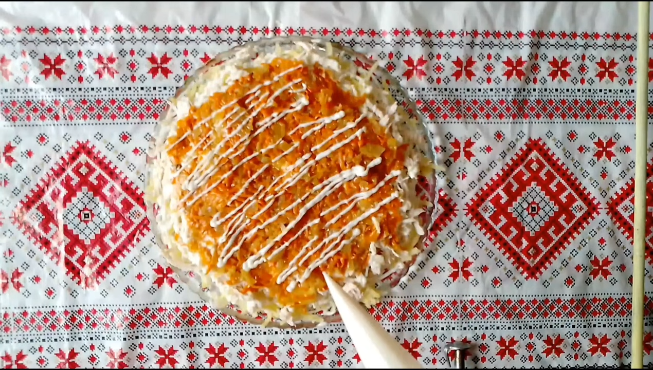 І от, нарешті, збірка салату. Спочатку викладіть на тарілку сітку з майонезу. Далі рівномірно розподіліть натерту картоплю, знову зробіть сітку з майонезу й наступним шаром викладіть підготовану курятину та також промажте майонезом. Потім додайте обсмажену моркву з цибулею, злегка притисніть ложкою, намалюйте майонезну сітку.