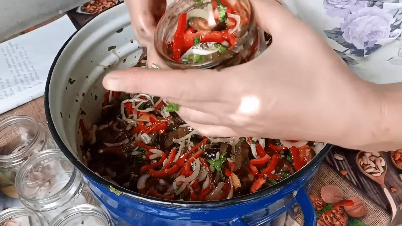 Тепер змішайте овочі: у велику каструлю викладіть баклажани, цибулю, солодкий перець, часник та зелень. Влийте олію, оцет, додайте сіль і цукор. Перемішайте, щоб усі овочі просочилися маринадом та дайте настоятися, а тоді наповніть стерильні банки сумішшю, злегка ущільніть і залиште на 1 годину, аби овочі пустили сік і розкрили аромат.
