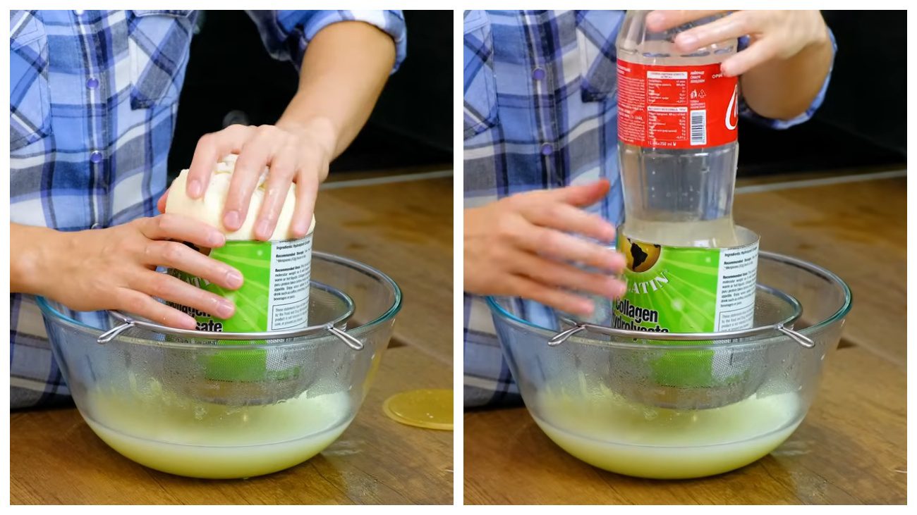 Сформуйте у потрібну вам форму. Наприклад, у консервній банці з-під фруктів обріжте кришечку та дно. Покладіть туди ще гарячий сир, а зверху блюдце та невеликий вантаж вагою 1–2 кг (щось на кшталт пляшки з водою).