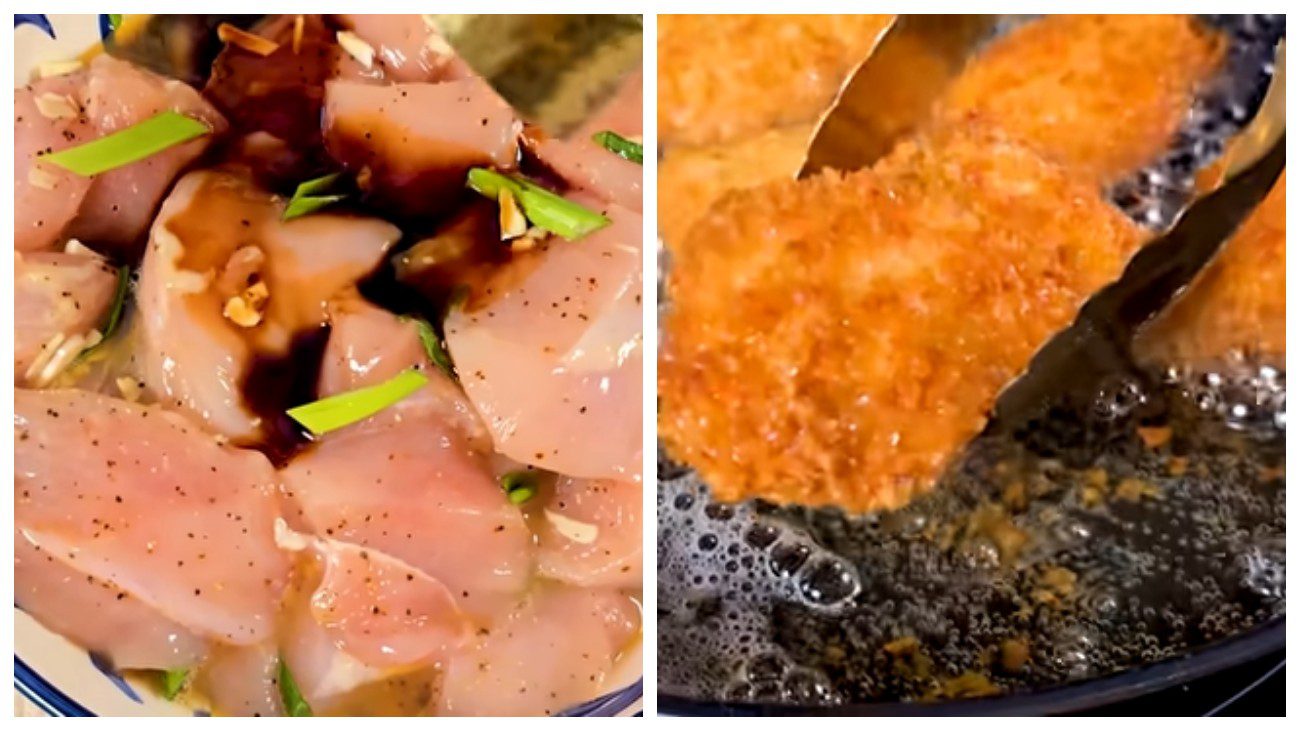 Після того подрібніть скибочки хліба в крихту в блендері або розітріть у пакеті — отримаєте чудові домашні панірувальні сухарі (або використовуйте покупні). Насипте кукурудзяний крохмаль в окрему миску, збийте яйця у другу, а крихти — у третю. Вмочуйте кожен шматочок спочатку в крохмаль (щоб утворилася суха “основа”), потім у яйце, і — в крихти.