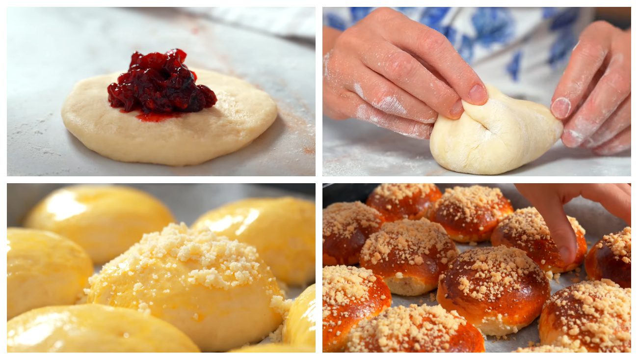 Наступний крок — формування булочок, змащування та посипання. Отже, поділіть тісто на шматочки, після чого розкачайте їх у кружальця. Покладіть ложку начинки в центр і зліпіть краї. Викладіть булочки на деко, змастіть жовтком, змішаним із молоком, та щедро посипте штрейзелем.
