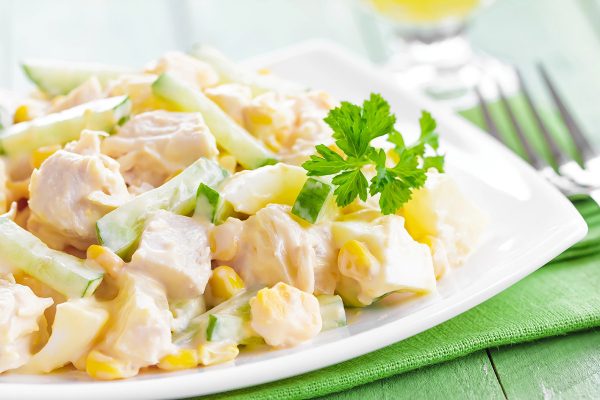 - Варена ковбаса або куряче філе – близько 300 г. Саме м’ясо робить салат ситним і головним “героєм” страви.