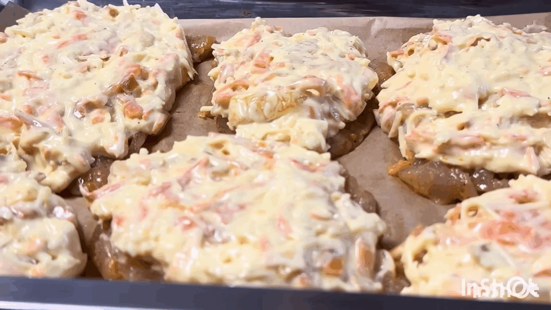 Готові відбивні виглядають апетитно – сирна шапочка не розтікається, а м’ясо виходить м’яким і соковитим. У цій страві все збалансовано: ніжність курятини, солодкість моркви, аромат цибулі та вершковий присмак сиру.
