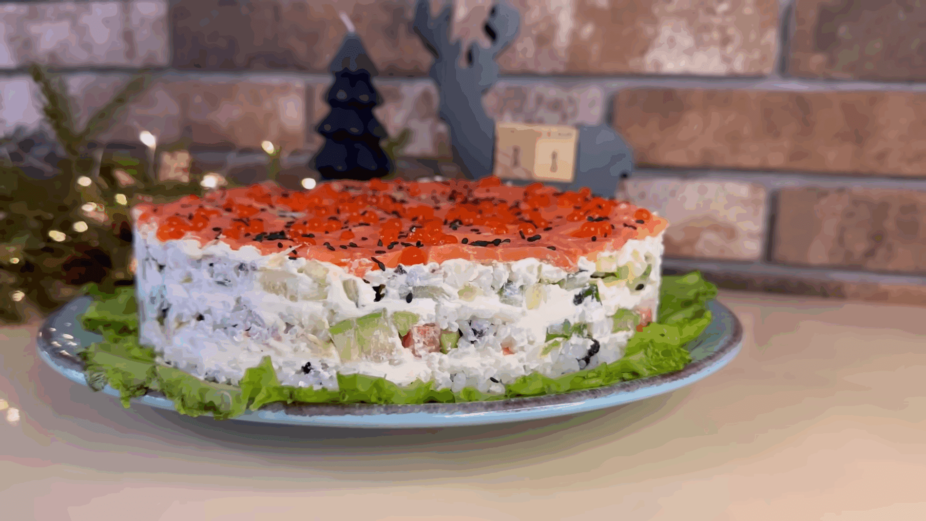 Зверху прикрашаємо тортик ікрою, кунжутом і зеленню. Виглядає він яскраво, апетитно й святково. На смак – ніжний, свіжий і збалансований.