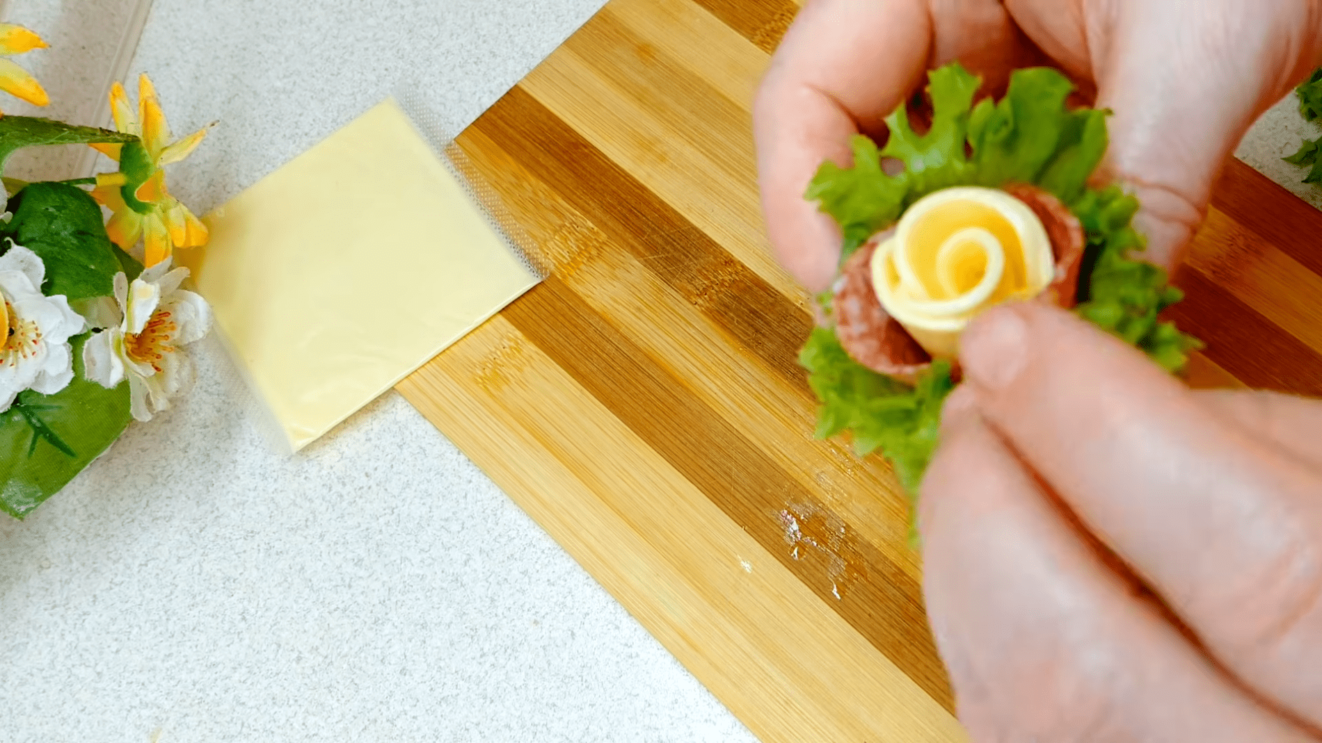Далі формуємо сирну троянду: чотири кружечки кладемо з легким нахльостом один на один і обережно скручуємо без сильного затягування, щоб «пелюстки» залишалися повітряними. Потім беремо дві тонкі пластинки ковбасної нарізки, викладаємо їх також із нахльостом і загортаємо всередину сирну заготовку. Краї ковбаски трохи піднімаємо та розкриваємо, надаючи квітці об’єму й природної форми. Так утворюється маленька, але дуже ефектна троянда.