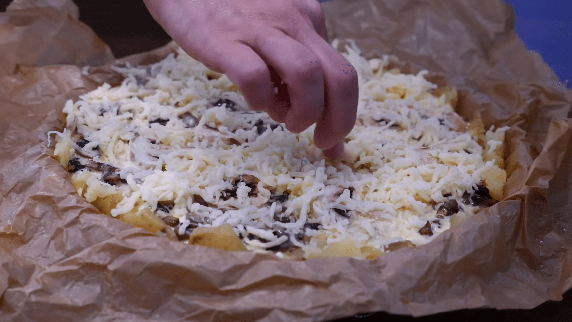 У миску висипаємо борошно, додаємо холодне вершкове масло, нарізане шматочками, солимо й приправляємо перцем та паприкою. Всипаємо розпушувач і перетираємо масу до стану однорідної крихти. Додаємо яйце та замішуємо тісто. За потреби підливаємо 1–2 столові ложки води, орієнтуючись на консистенцію: тісто має зібратися в м’яку грудку й добре тримати форму. Накриваємо його харчовою плівкою та залишаємо відпочити, поки готуємо начинку.
