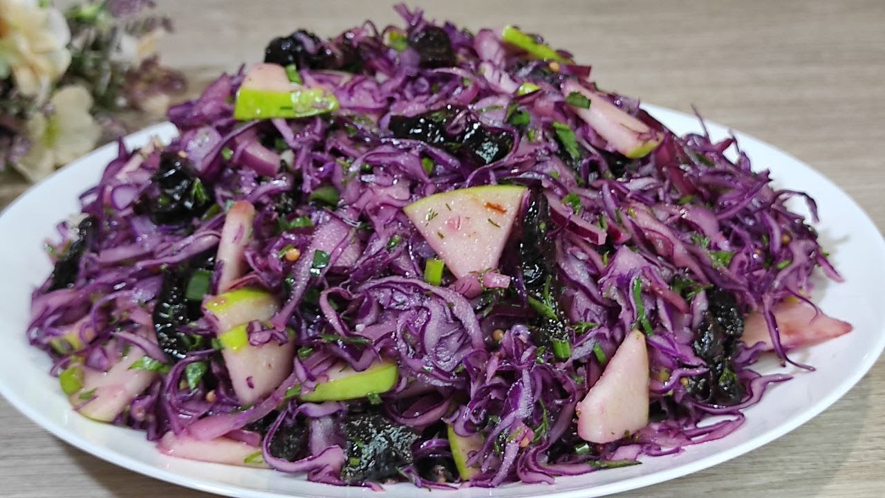 У складі цього цікавого салату — червона капуста, морква та свіжий огірок, які не лише додають корисних властивостей, а й створюють справжній калейдоскоп кольорів. Кунжутна заправка надає салату неповторний смаковий акцент, роблячи його ще більш апетитним. Такий салат стане чудовим доповненням до вашого раціону, підніме настрій і додасть свіжості будь-якій трапезі.