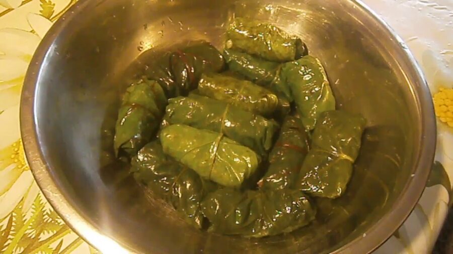 Далі на кожен лист буряка викладіть невелику кількість начинки, загорніть його краї та скрутіть рулетиком або конвертом. Дно каструлі змастіть олією, викладіть кілька бурякових листків (можна використовувати ті, які не підійшли для загортання), щоб долма не підгоріла. Потім укладіть вироби щільно в один або два шари, заливаючи кожен невеликою кількістю води або овочевого бульйону, а останній вкрийте так, щоб конвертики повністю були під нею. Покладіть туди лавровий лист і дрібно нарізаний часник. Тепер закрийте каструлю кришкою і доведіть до кипіння на середньому вогні, а після того зменште вогонь до мінімуму і тушкуйте 30-40 хвилин.