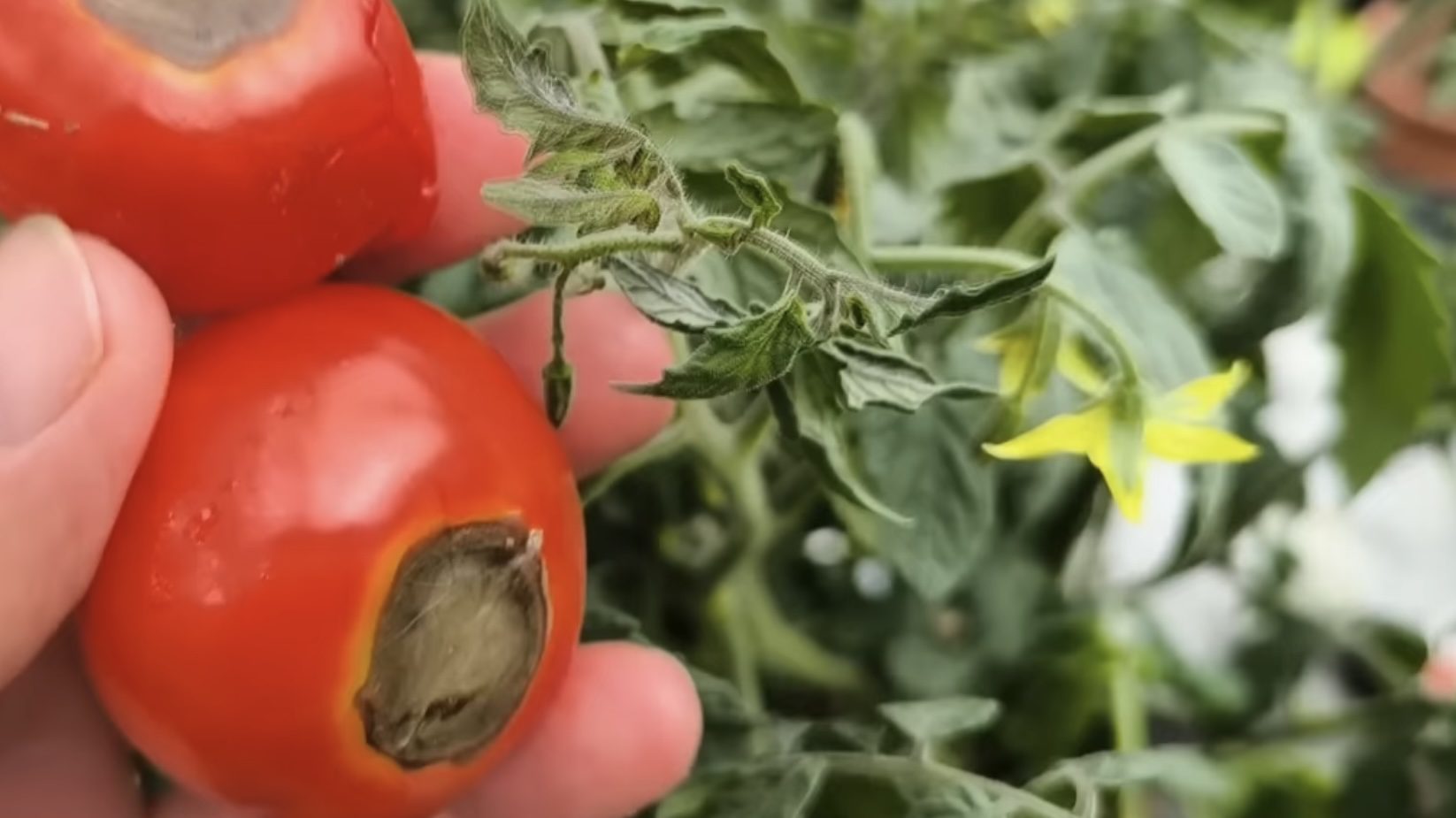 Спочатку маленькі, незрозуміло на що схожі, але вже за кілька днів пляма розростається і охоплює ледь не пів плода. Вона розташована знизу помідора, має темний колір, а мʼякоть під плямою підгниває. Ймовірніше за все це вона — вершинна гниль.